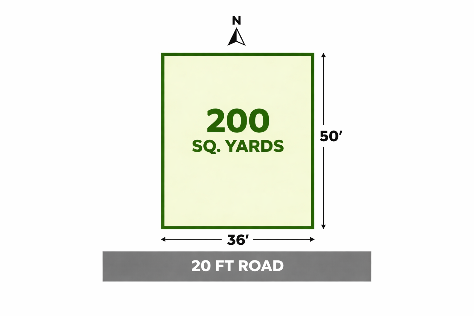 This residential plot covers 200 square yards with dimensions of 36 × 50 feet. The plot has a regular shape, which allows easy and efficient construction planning. Its north-facing orientation ensures balanced sunlight and proper ventilation throughout the day. Because of this, the plot is well suited for comfortable family living.